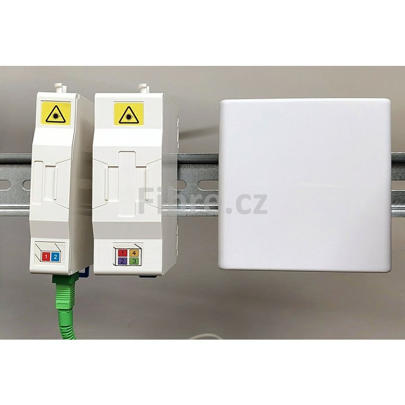 Optická zásuvka pro 1-4 vlákna ve velikosti jističe, instalace na DIN lištu. Určeno pro uložení předkonektorovaného kabelu i pro pigtail + kabel.