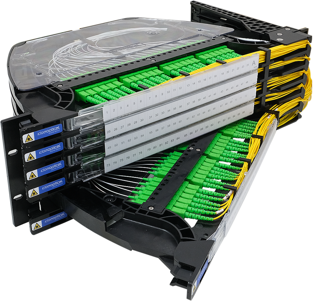 Modulární 19" výklopný 3U optický rozvaděč se 144 SC/APC adaptéry i pigtaily s vlákny G.657A2